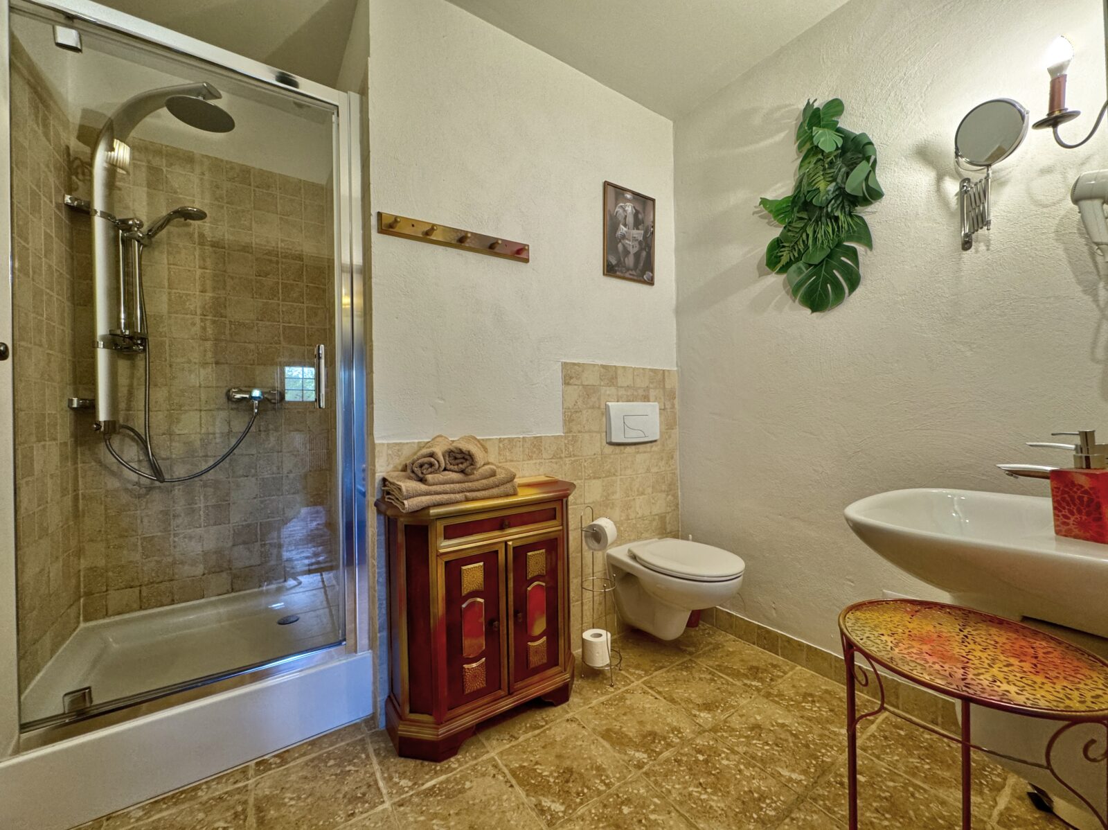 The spacious bathroom invites you to unwind with a hot shower or freshen up quickly. Equipped with an array of towels in various sizes, a makeup mirror, and a hairdryer, your comfort is fully catered to. Additionally, the spa area offers a sauna and whirlpool for further relaxation, or you can opt for a refreshing dip in the midst of the forest and nature and explore The Valley.